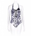 Wit badpak Glam Latino Parah! Zwarte print v. zwierige bloemen, voor diepe uitsnede m. macramé-kant en kanten bloem-corsage. Shop online bij Italian Design!